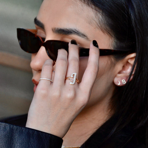 Heirloom or not? Old school.. meets new age. Our old script initial collection is a fresh take on the old school design. This keepsake rings stay true to the old school vintage designs while mixing in a fresh contemporary look. Pair with our dainty diamond stacking bands to add some dimension to your look. Dressed down with a comfy holiday look or up with a contemporary styling, this ring feels like home.