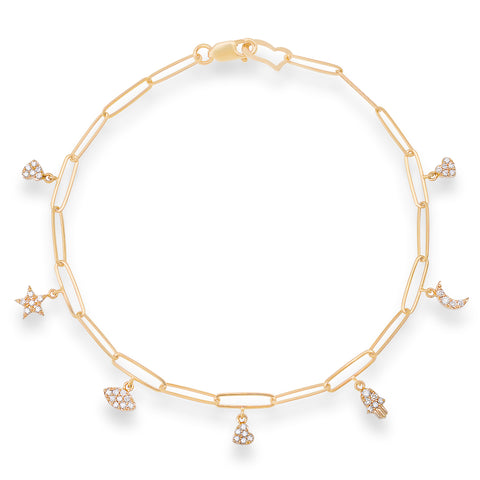 Fixed to a 14k solid gold paperclip chain, these mini dangling charms are dainty and happy. Adorned with genuine white diamonds, the assortment of charms include a heart, crescent, hamsa, evil eye and star. Some people decorate a tree holiday time.. and some decorate their wrists.