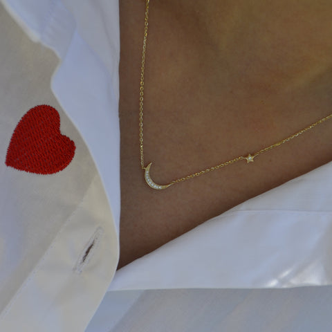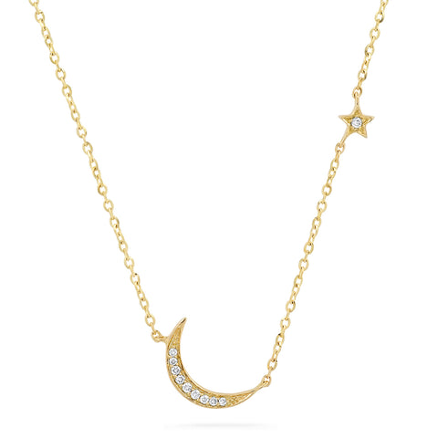 For the dainty jewelry wearer, this delicate moon and star necklace has been an online favorite. With the moon and star charms fixed to the chain, the moon features nine white diamonds and a tenth diamond set in the tiny star. Worn close to your heart, this moon and star necklace represents infinite love.. in any form it may be.