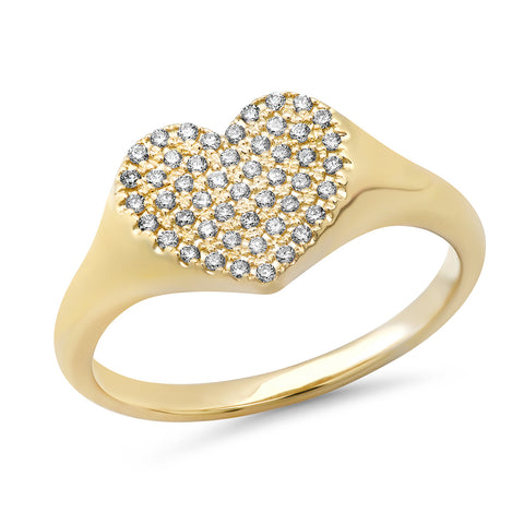 The gift of love that she wont want to take off. Set in solid 14k gold, this signet heart ring features white glittering white diamonds and a polished gold band. Although conventionally worn on the ring or middle finger, this signet ring can be worn as a pinky ring as well. Versatile for every day wear, it adds and elevates any look. Paires well with a casual denim & blazer ensemble and just as well with a more formal look. You wont want to take it off!