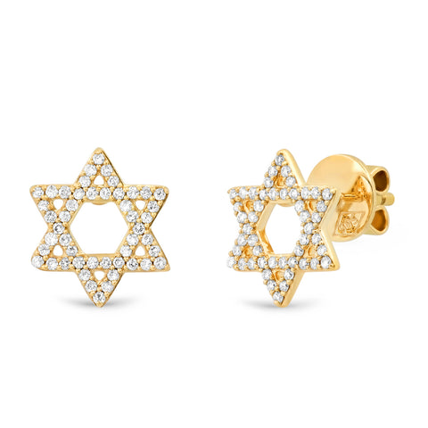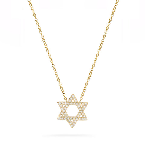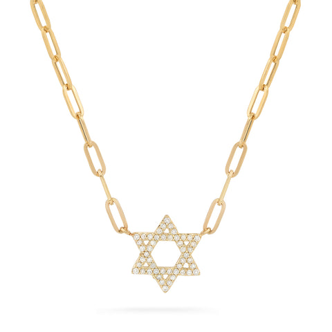 Recently, stars like Gal Gadot, Elizabeth Lizzie Savetzsky, Noa Tishby, Emmanuelle Chriqui, Mayim Bialik, Selma Blair and Dr. Sheila Nazarian have been seen wearing their Star of David Magen David jewelry proudly. As seen on Emmanuelle Chriqui, the classic diamond Star of David necklace was originally the only Magen David piece in the collection. After selling out multiple times, we added the coordinating Star of David - Magen David gold and diamond ring and earrings to the collection, as seen on Emmy nominated Dr. Sheila Nazarian. This genuine 14k gold and white diamond Star of David pinky ring or ring finger ring can be stacked or worn on its own to make a statement. The Magen David stud earrings are dainty and sparkly featuring .24ct white diamonds in a solid gold setting, as seen on speaker and author Noa Tishby. Adding to the collection in recent months, the paperclip Star of David necklace ads a modern take on the classic Magen David necklace. Fixed to a paperclip adjustable chain, the Star of David pendant features white diamonds set in a 14k gold setting.